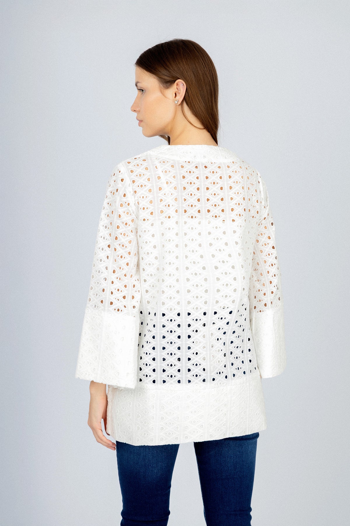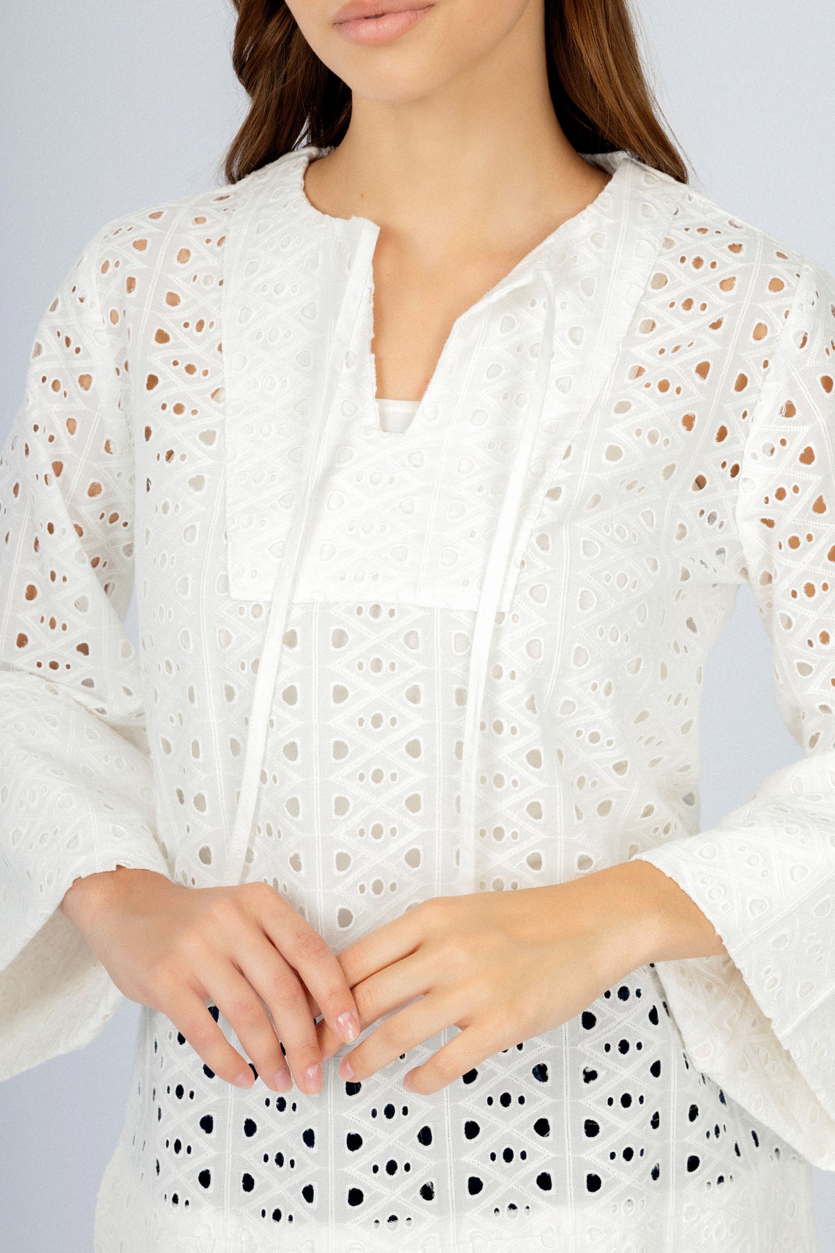 النمط: بلوزة قطنية بيضاء مزخرفة بزهور مع أكمام متسعة