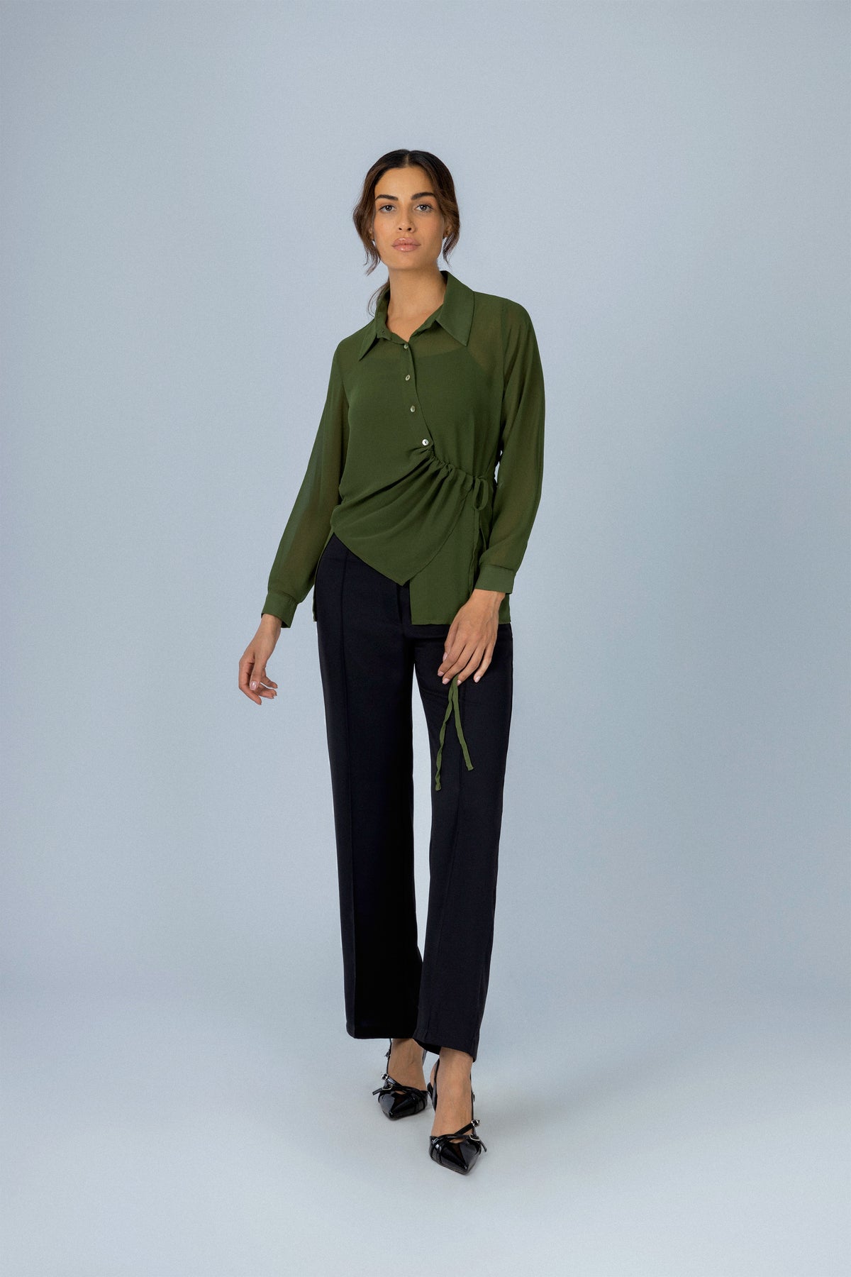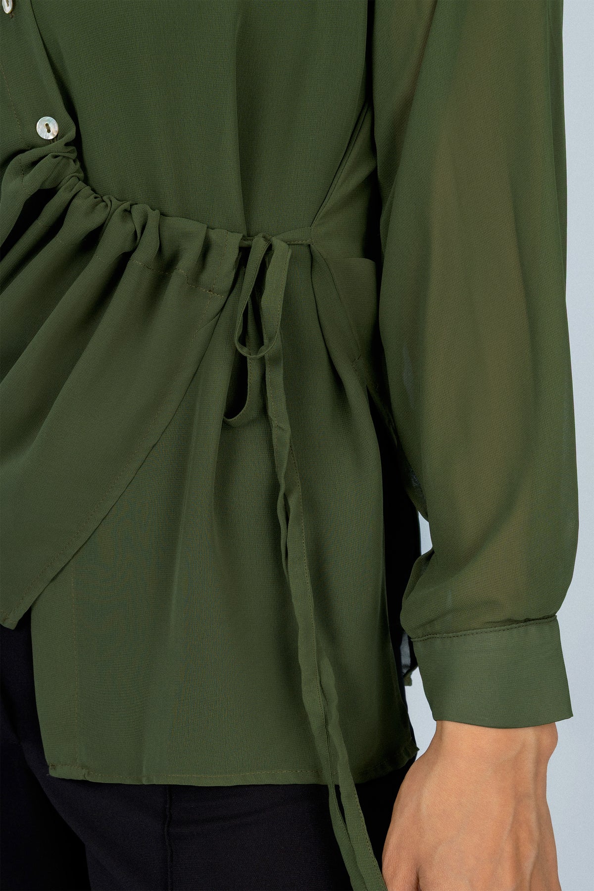 Pattern: Asymmetrical ruched detail on one side, with an adjustable drawstring tie at the waist