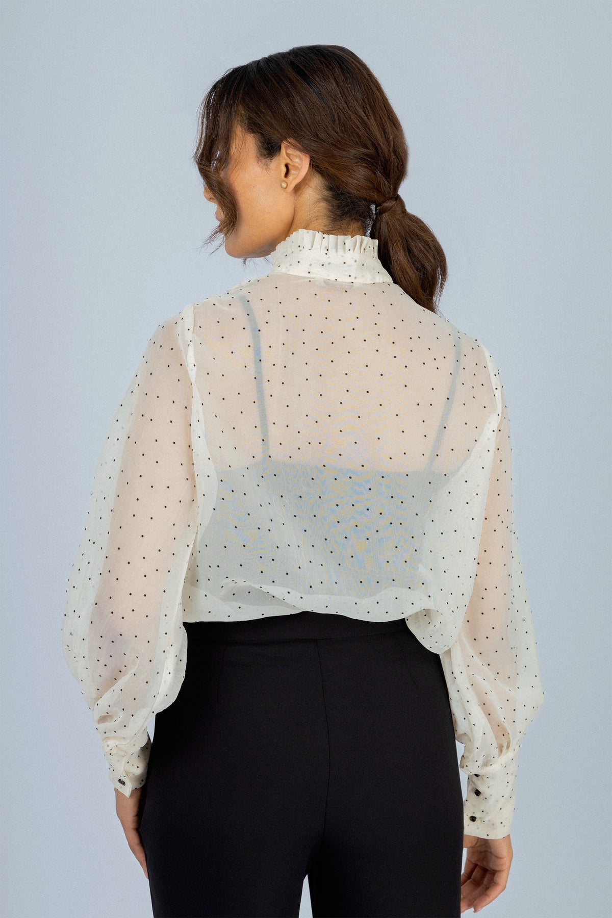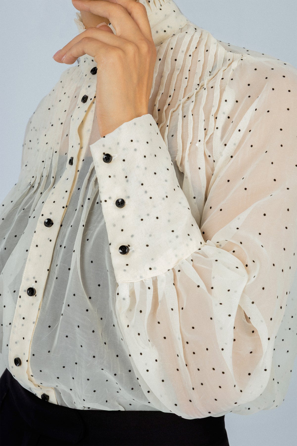 النمط: طيات عمودية دقيقة، أكمام منتفخة طويلة، نقاط بولكا