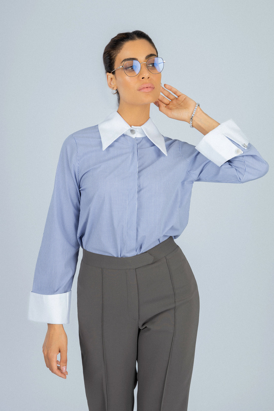 قميص كلاسيكي مخطط بلون أزرق فاتح من مزيج البامبو