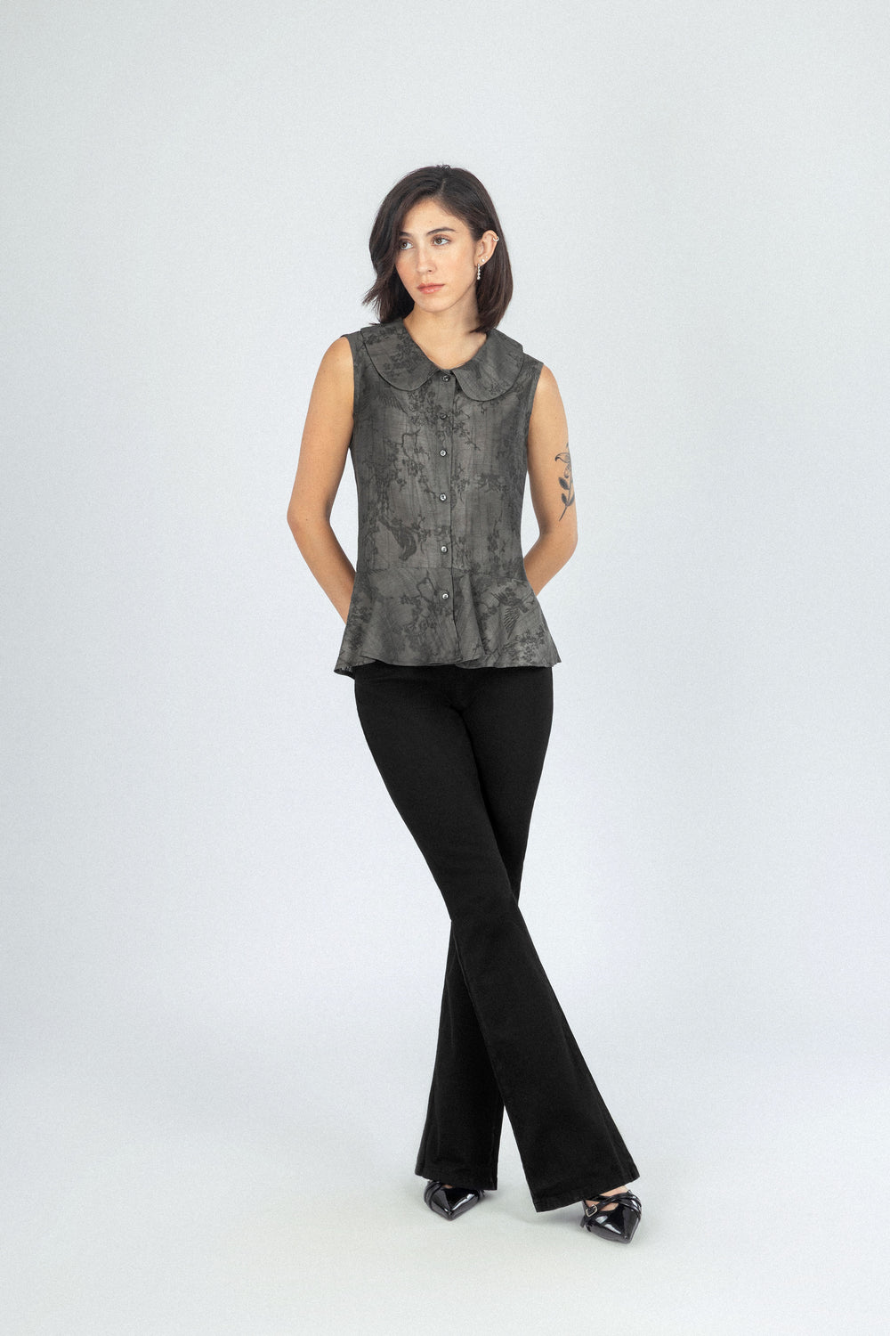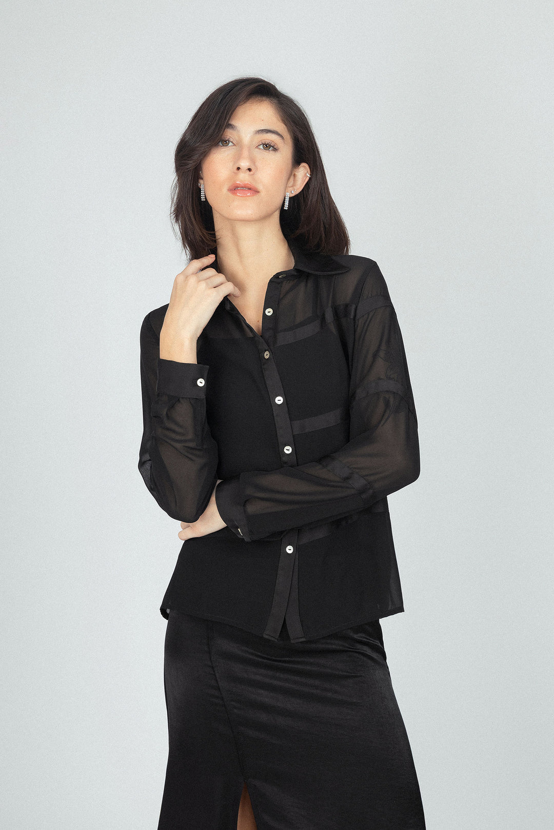 قميص شفاف كلاسيكي من الشيفون بلون أسود