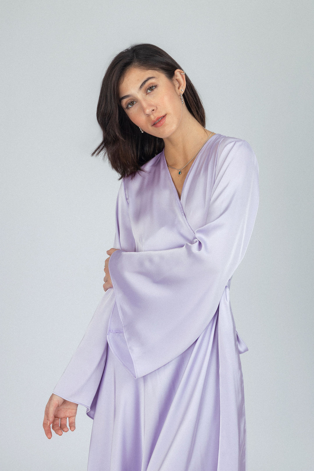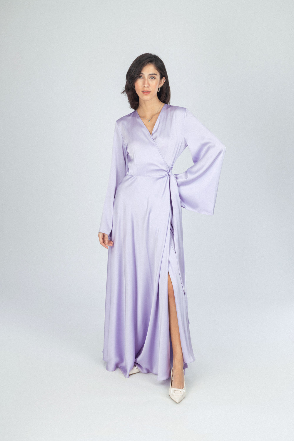 فستان كلاسيكي طويل من الساتان بلون بنفسجي فاتح