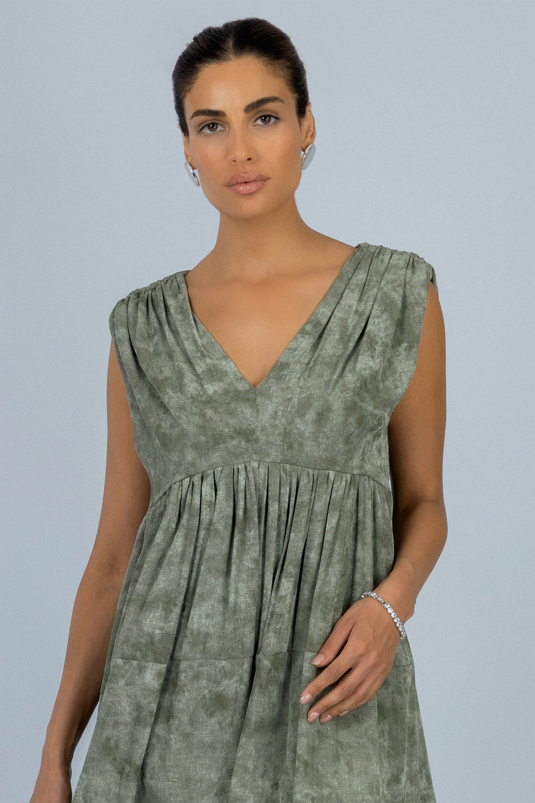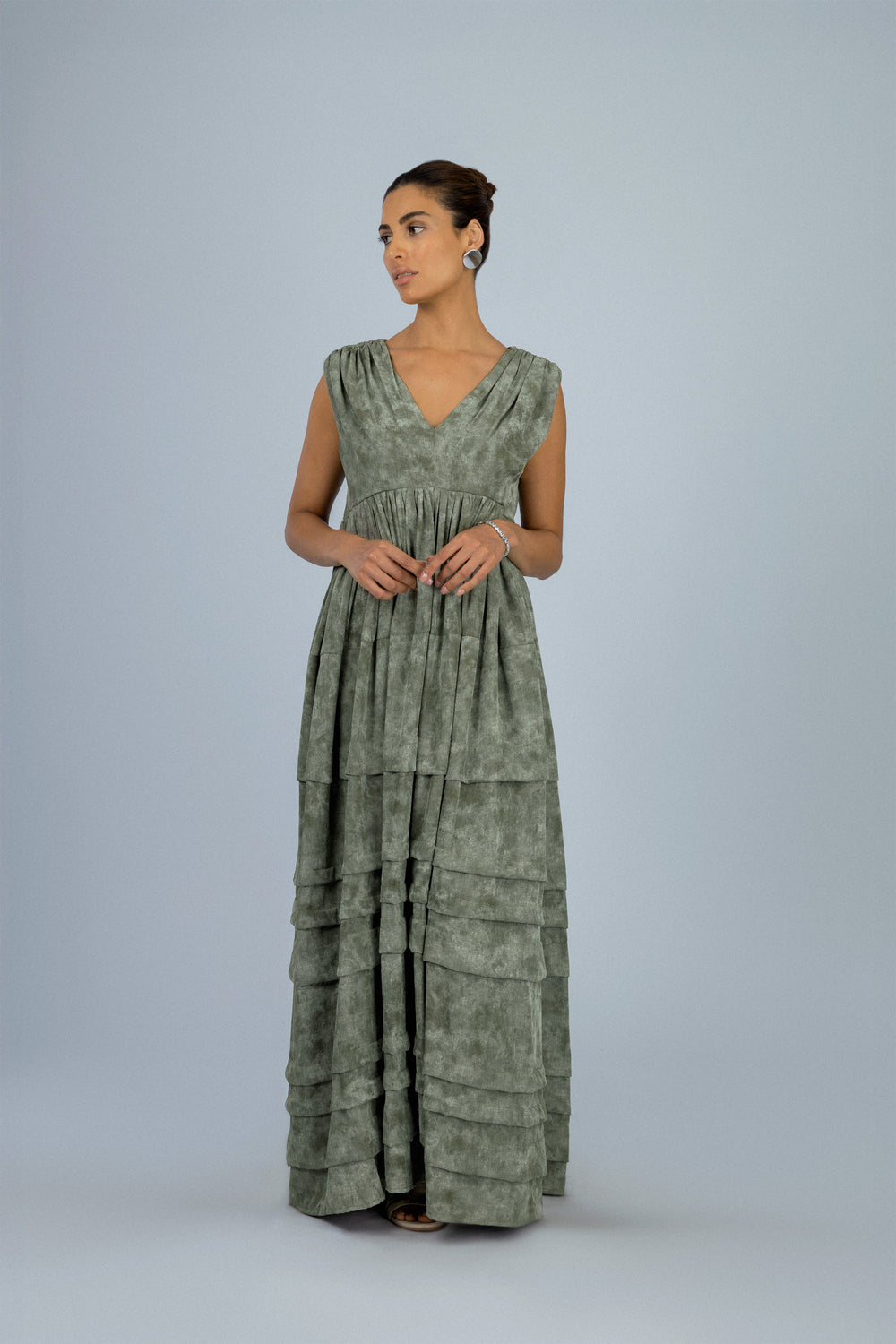 فستان بدون أكمام بطبعة خضراء ومصمم بطبقات