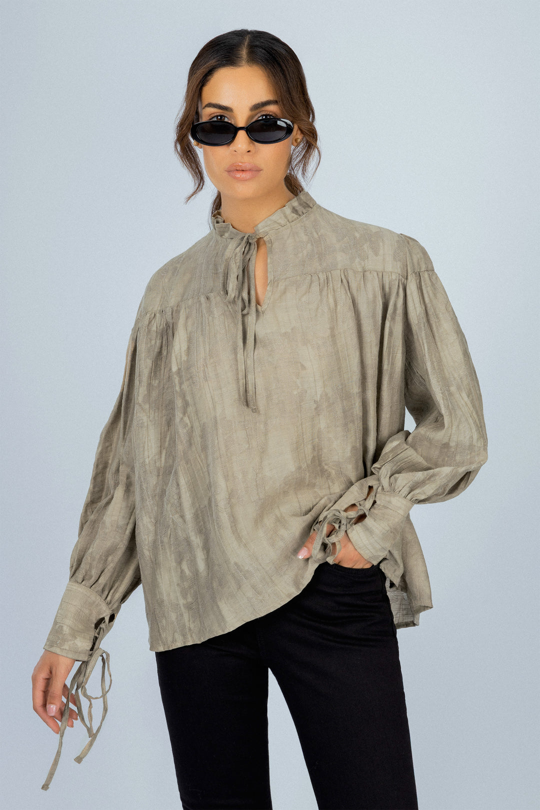 بلوزة جاكار مزخرفة باللون البيج