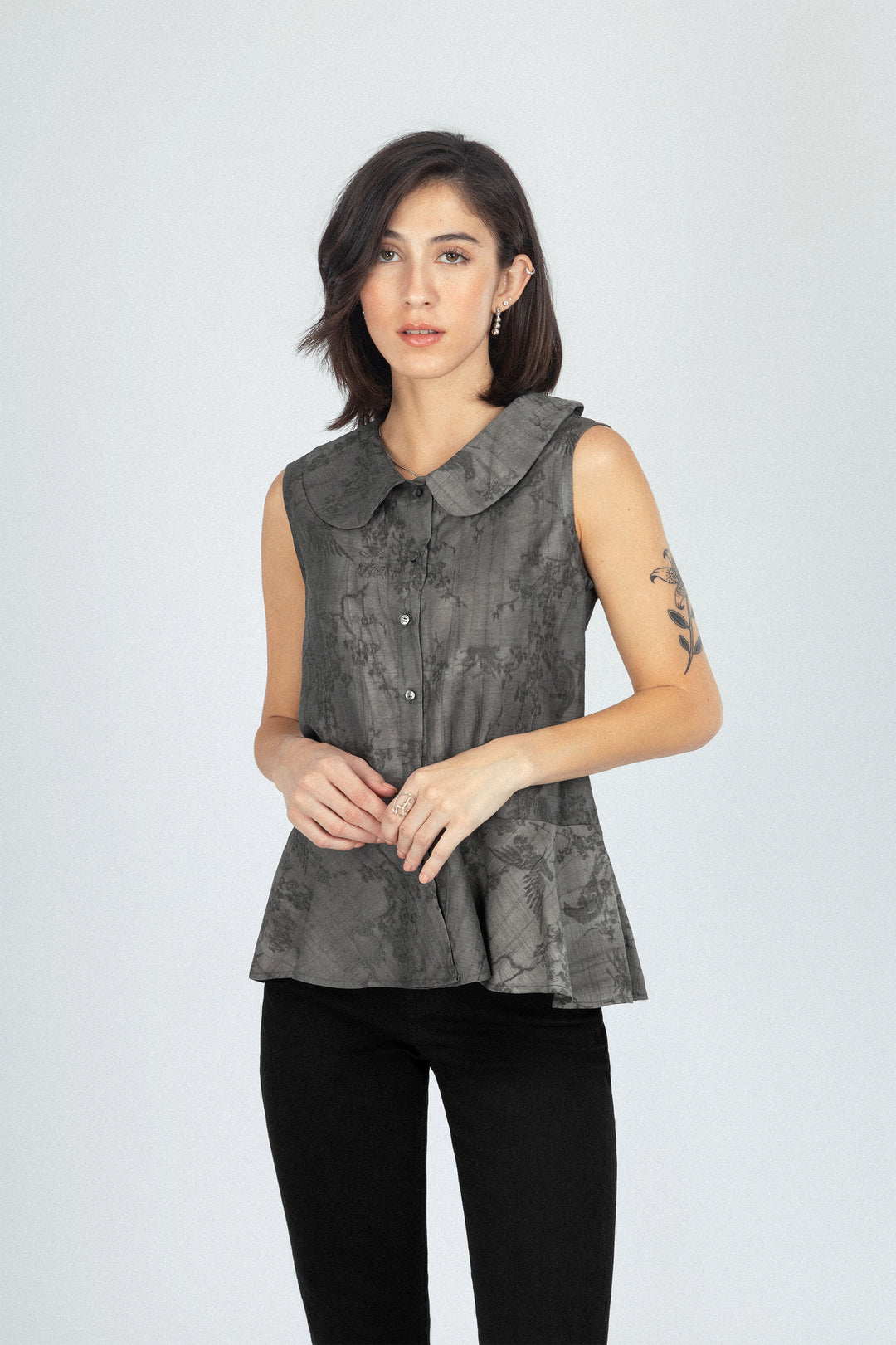 بلوزة بدون أكمام بنمط زهري بلون رمادي داكن