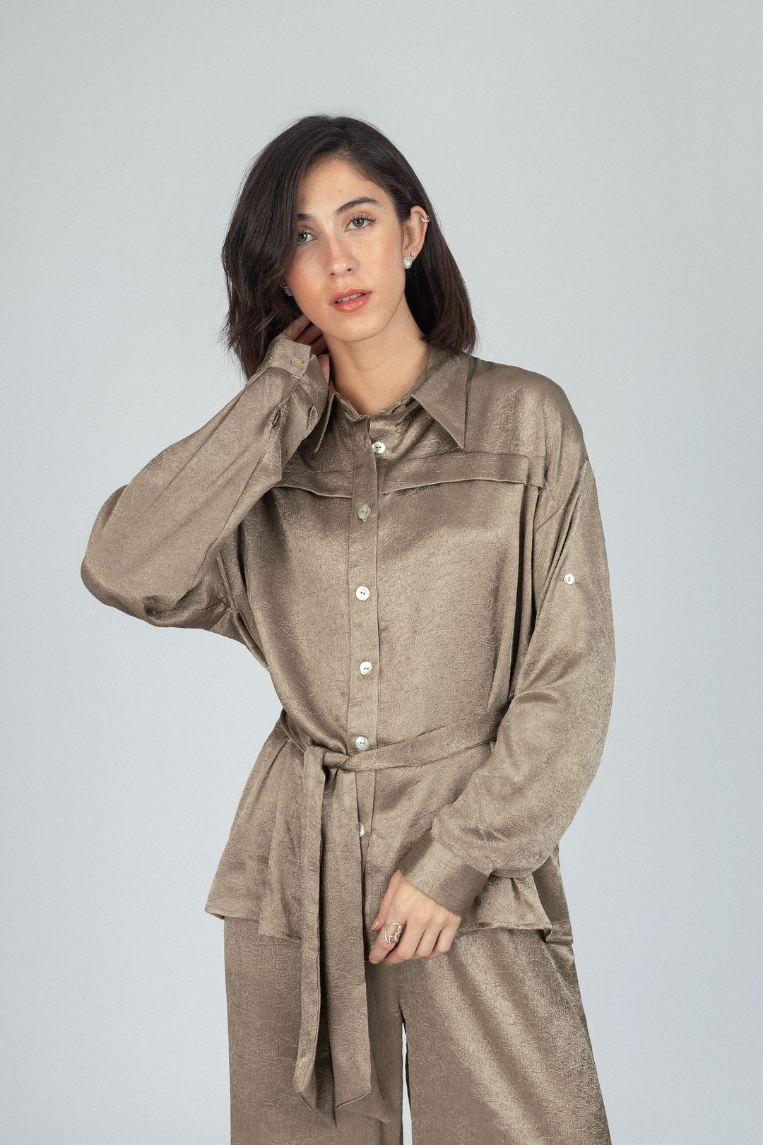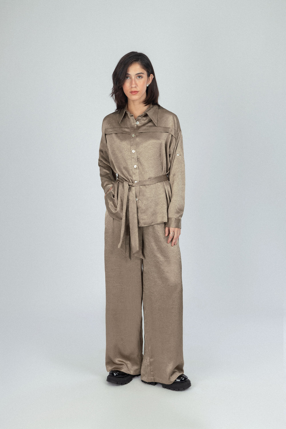 بدلة ساتان بنمط بلون الخاكى
