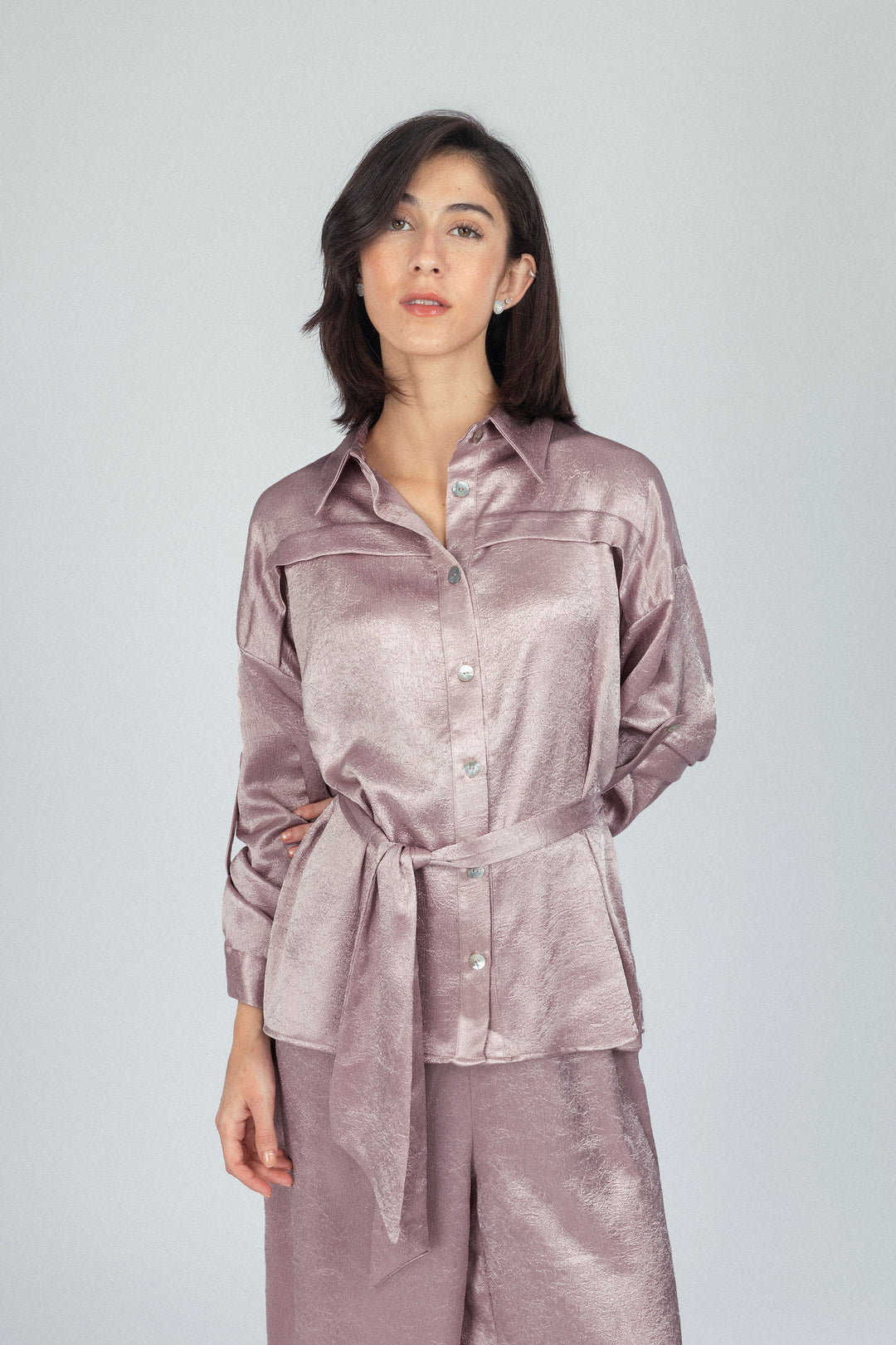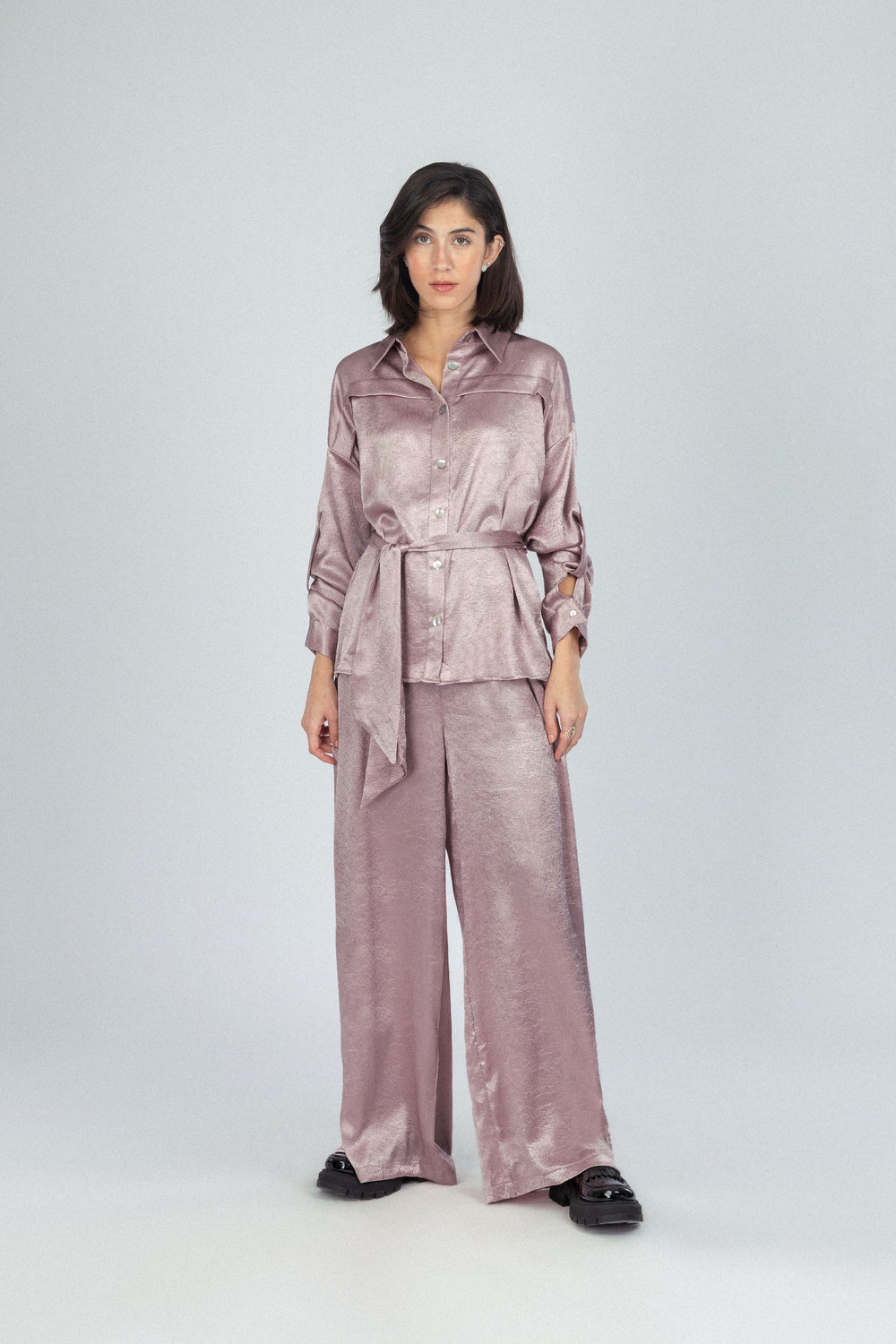 بدلة ساتان بنمط بلون البني الوردي